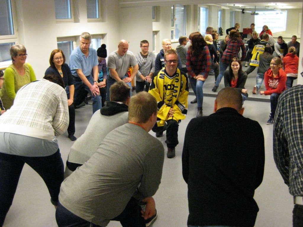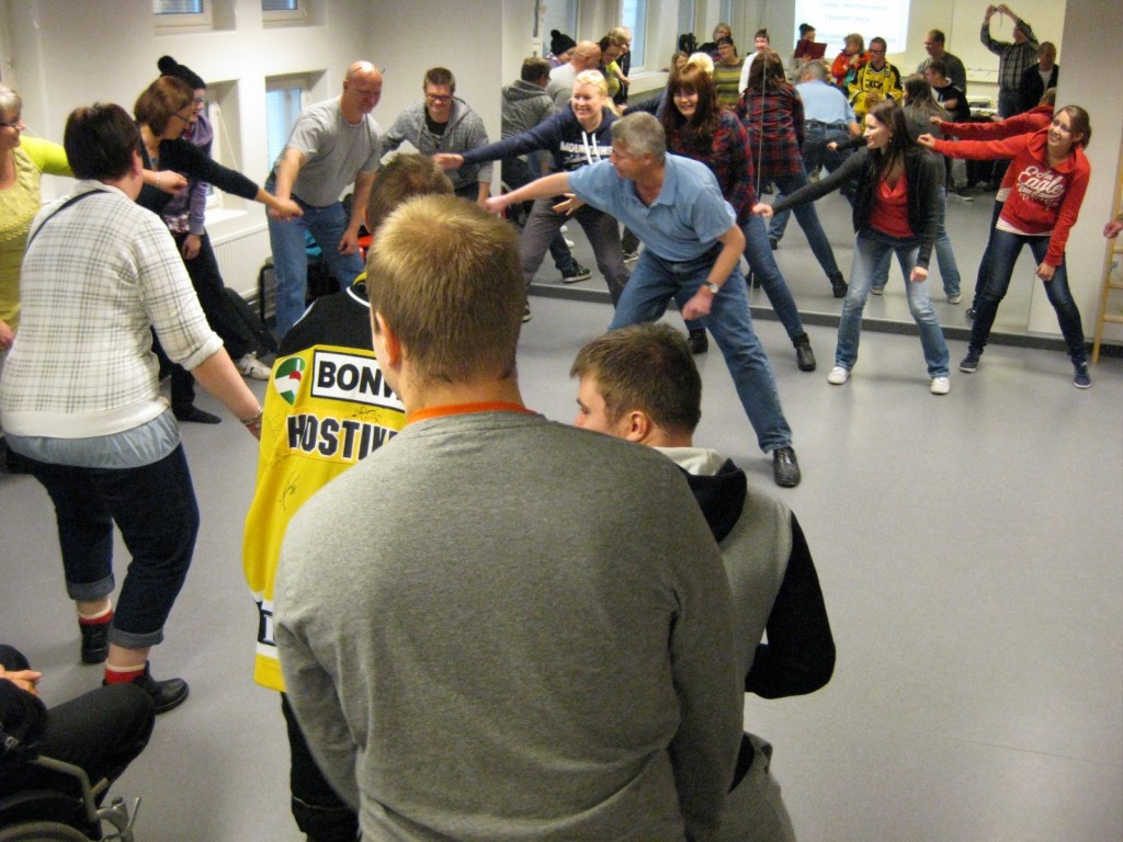 Mari vetää alkulämmittelyt Sampo-koulun lähihoitajaopiskelijoille.